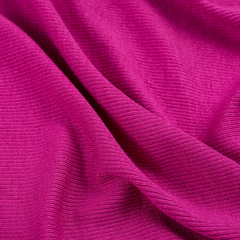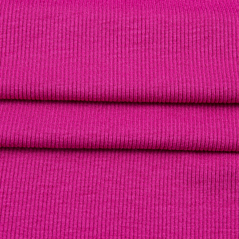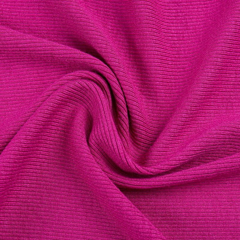 Este tejido de punto de costilla Rayon Spandex está elaborado con una mezcla científicamente equilibrada de 95% rayón (fibra de celulosa regenerada) y 5% spandex, combinando la suavidad y transpirabilidad de las fibras de origen natural con el estiramiento y la recuperación del spandex. La tela presenta una estructura de punto acanalado de 18×7, lo que proporciona una textura fina y uniforme con excelente estiramiento lateral y retención de forma.